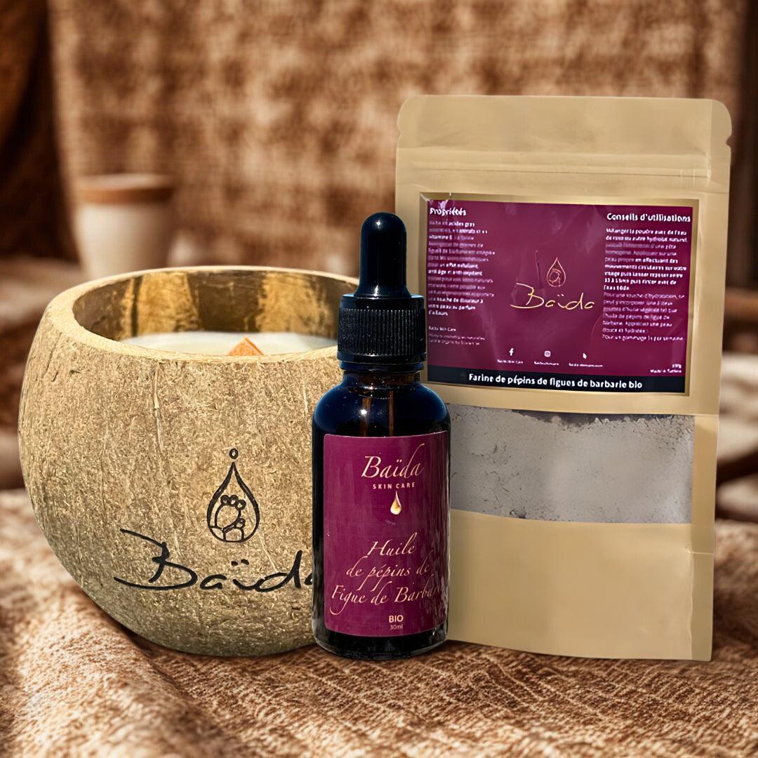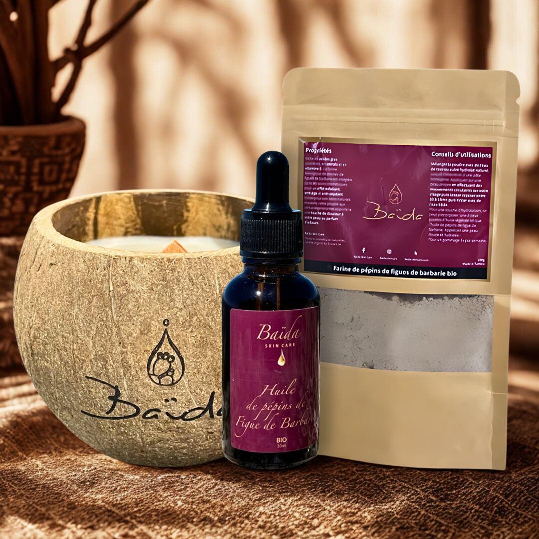 Offrez à votre peau et à votre esprit un moment de pure reconnexion. Ce coffret exclusif associe l’efficacité naturelle des pépins de figue de barbarie à un moment sensoriel unique grâce à une bougie parfumée de votre choix. Résultat : une peau éclatante, un teint unifié et un esprit apaisé.